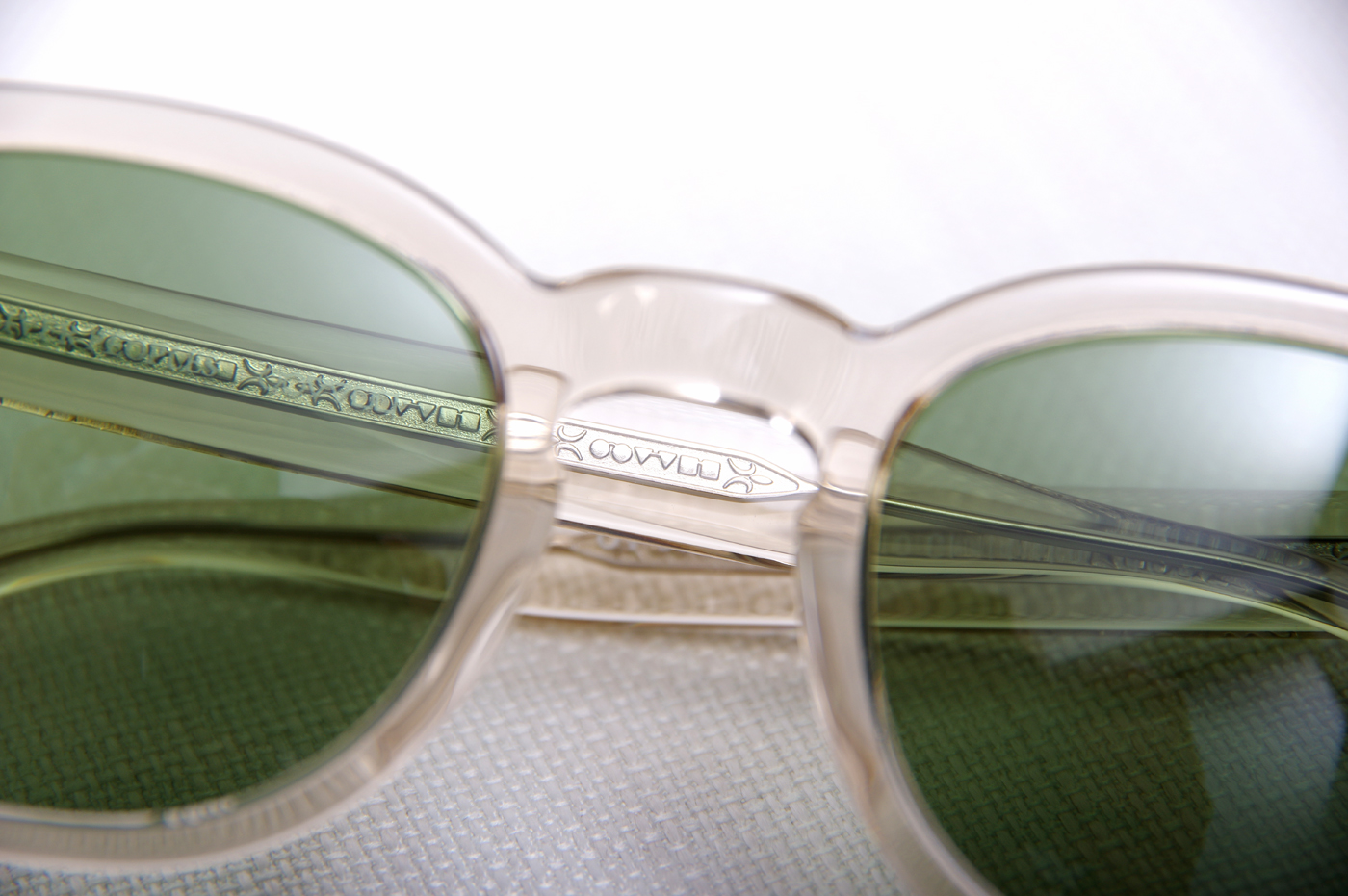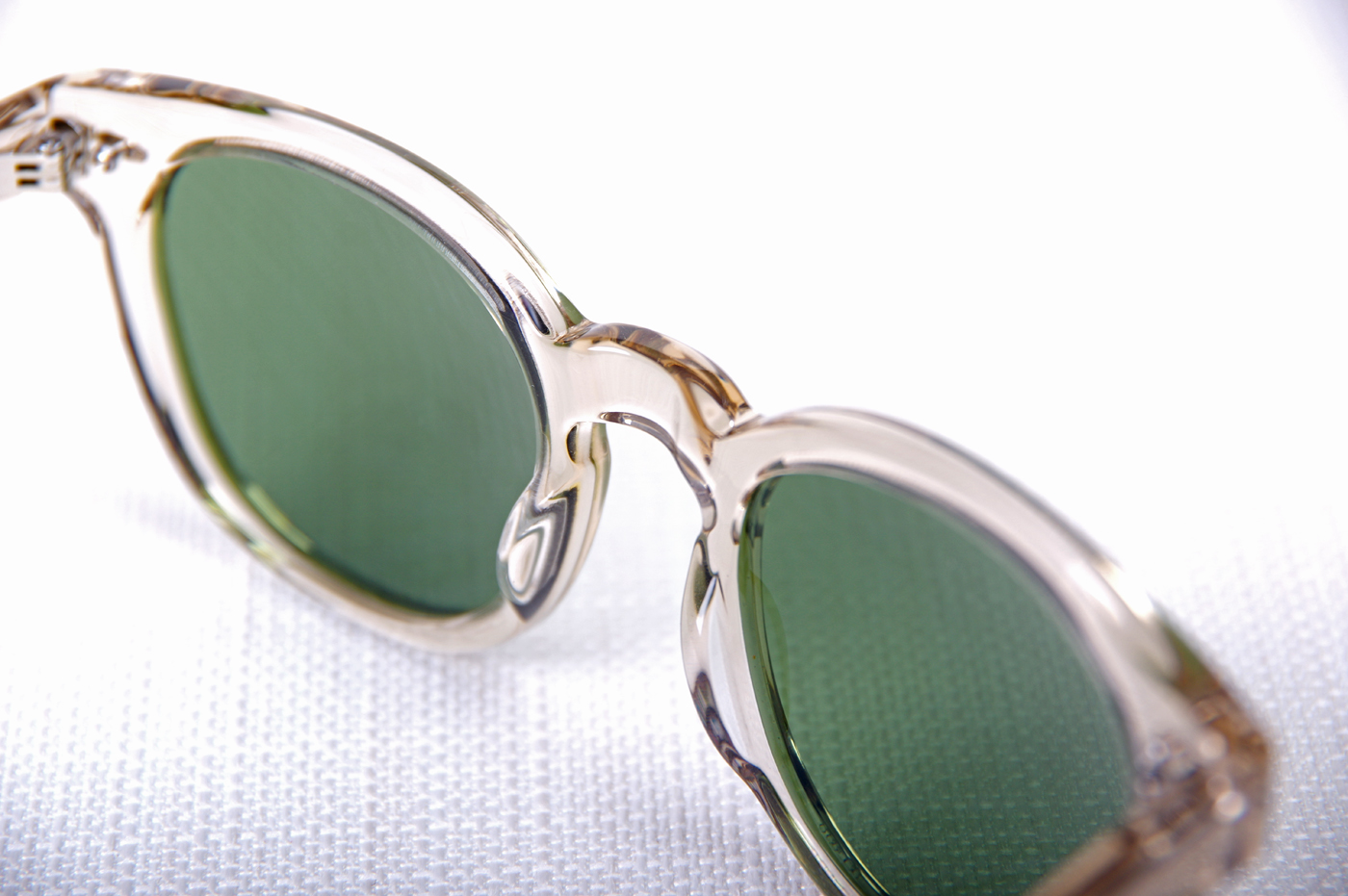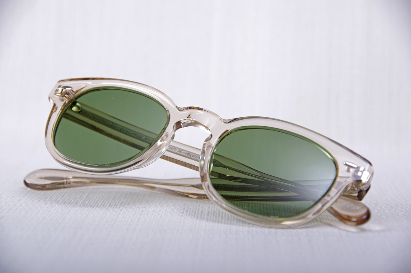 Les lunettes de soleil OLIVER PEOPLES SHELDRAKE SUN présentées ci-contre sont réalisées dans une couleur champagne translucide avec des verres de couleur verte. On peut remarquer par transparence sur l'armature métallique à l'intérieur de la branche le logo de la marque composée des 3 lunettes : une ronde, une triangulaire, une carrée.